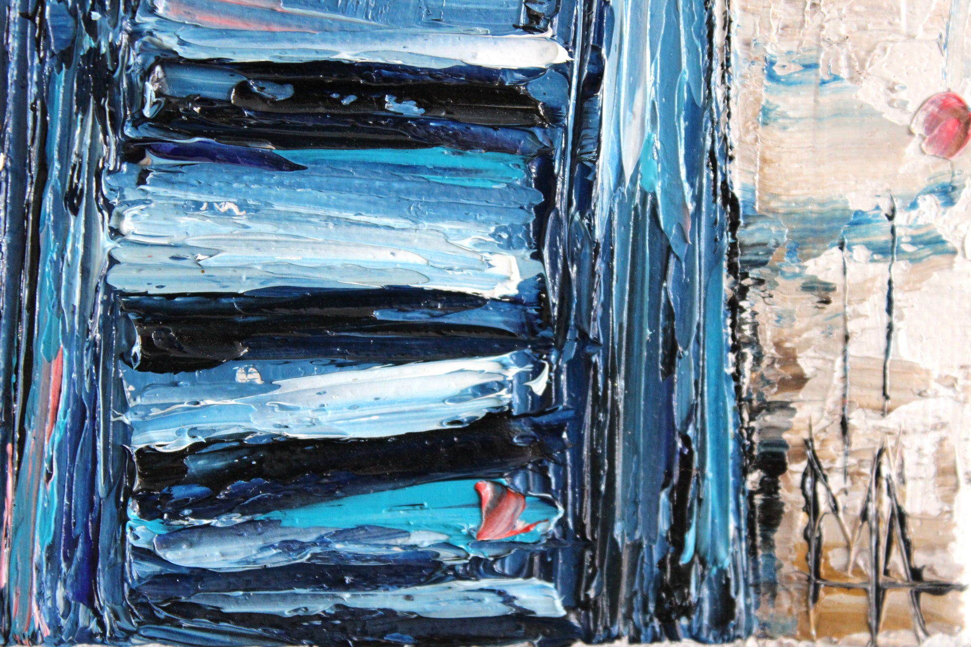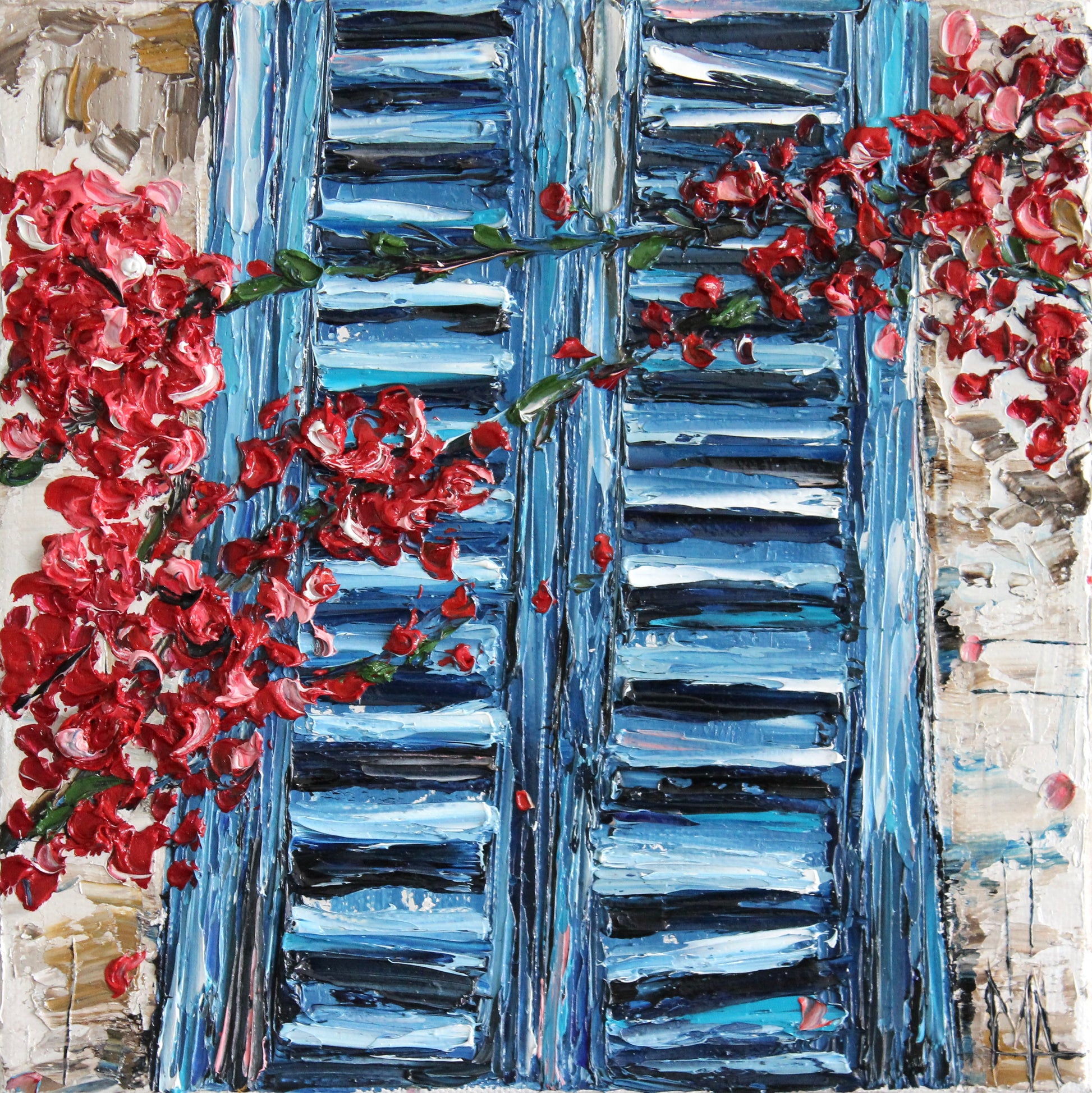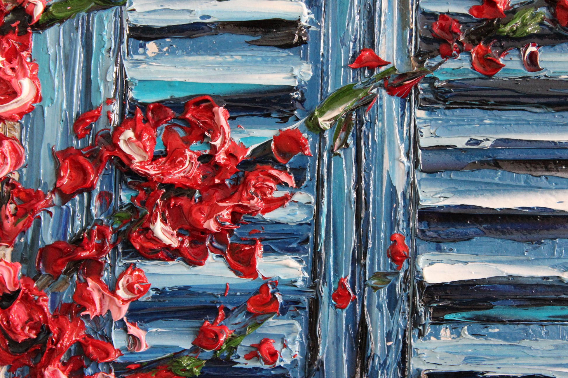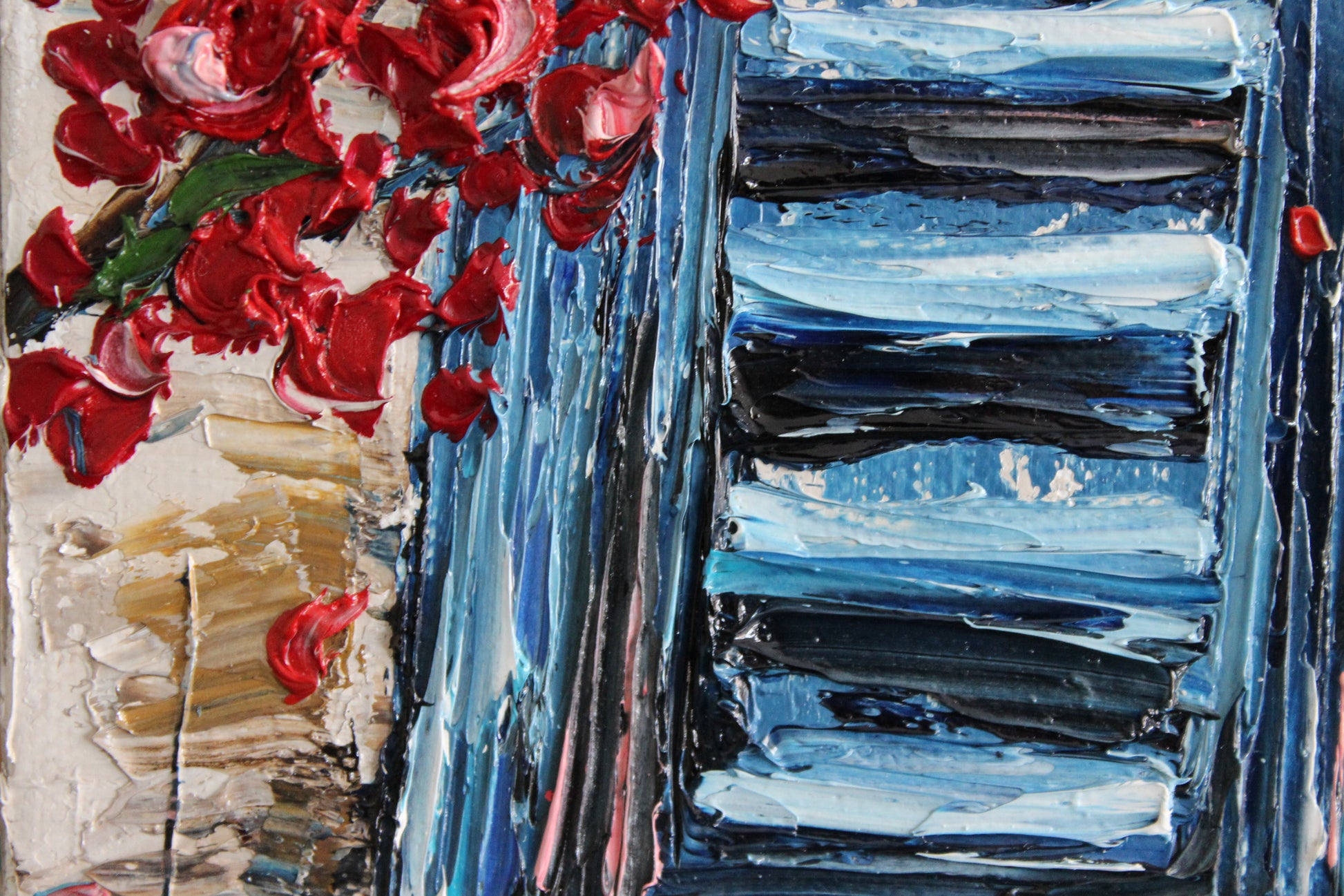 This textured palette knife painting features a vivid blue window framed by delicate flowering branches, evoking warmth and serenity. Inspired by Mediterranean charm, its vibrant colors and intricate details radiate joy and optimism.